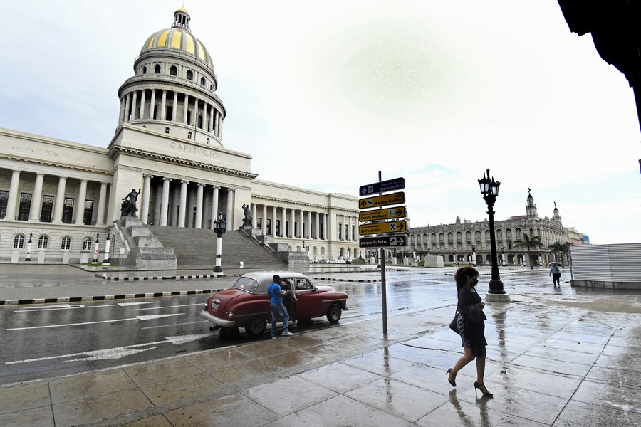 Imagen de archivo de una mujer caminando por una acera frente al Capitolio de La Habana, en La Habana, capital de Cuba, el 24 de junio de 2021. (Xinhua/Joaquín Hernández)