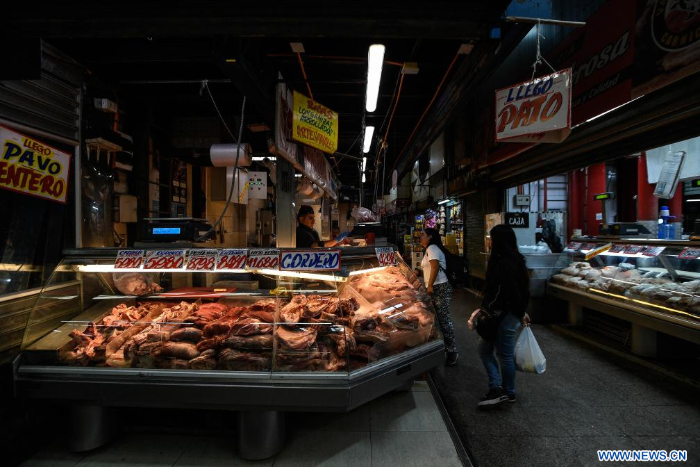 Personas realizan compras en una carnicería en el mercado La Vega Central, en Santiago, capital de Chile, el 19 de marzo de 2024. La economía chilena creció un leve 0,2 por ciento en 2023, arriba de lo esperado por analistas locales consultados por Xinhua, que preveían una nula o negativa expansión del Producto Interno Bruto (PIB) el año anterior, de acuerdo con cifras del Banco Central divulgadas el lunes. (Xinhua/Jorge Villegas)