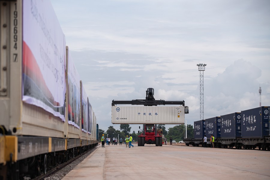 Imagen de archivo del 1 de julio de 2022 de mercancías transfronterizas siendo cargadas en un patio de tránsito de carga de la Estación Sur de Vientián del Ferrocarril China-Laos, en Vientián, Laos. (Xinhua/Kaikeo Saiyasane)