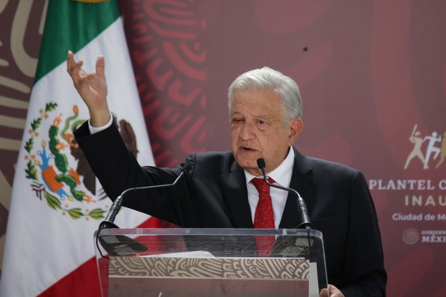 Imagen del 12 de febrero de 2024 del presidente mexicano, Andrés Manuel López Obrador, pronunciando un discurso en la Ciudad de México, capital de México. (Xinhua/Francisco Cañedo)