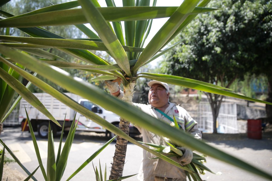 Imagen del 3 de abril de 2024 de un hombre realizando trabajos de mantenimiento en un jardín público en el marco del reconocimiento como "Ciudad Arbol del Mundo" a la alcaldía Tlalpan, en la Ciudad de México, capital de México. (Xinhua/Francisco Cañedo)