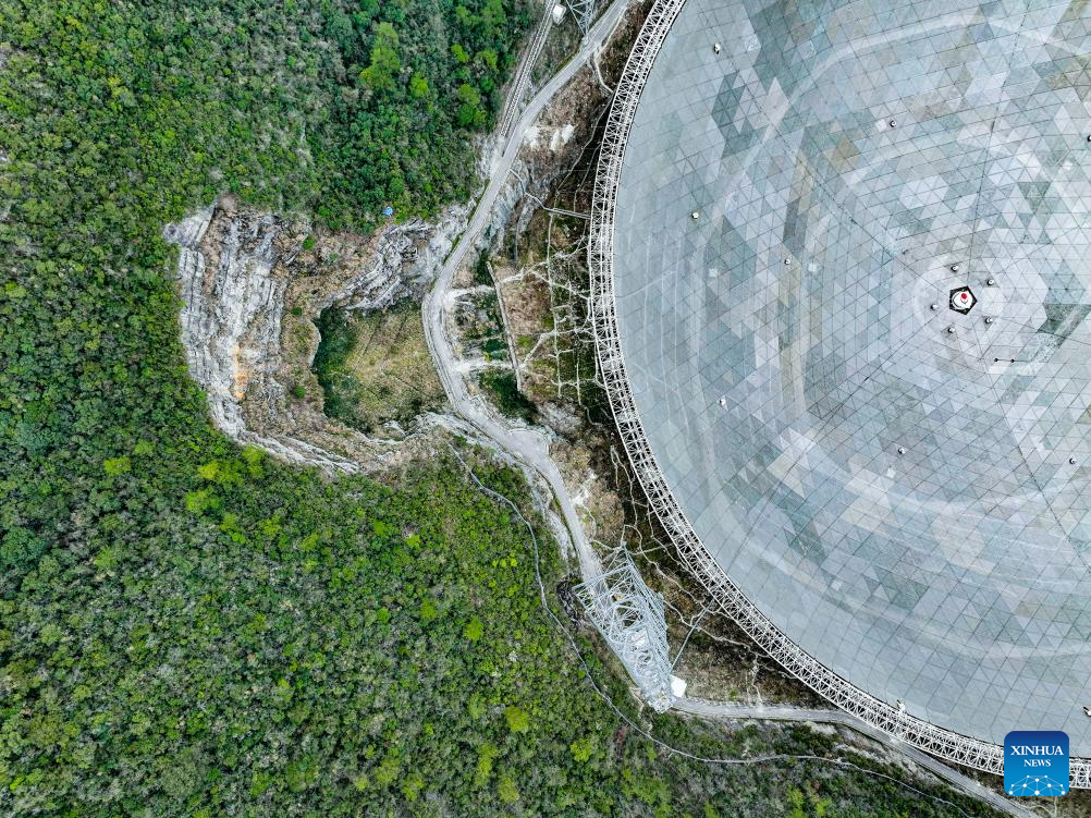 GUIYANG, 17 abril, 2024 (Xinhua) -- Imagen tomada con un dron el 27 de febrero de 2024 de una parte del radiotelescopio esférico de apertura de 500 metros (FAST, siglas en inglés) de China en mantenimiento, en la provincia de Guizhou, en el suroeste de China. El radiotelescopio esférico de apertura de 500 metros (FAST) de China, el radiotelescopio de un solo plato más grande del mundo, ha identificado más de 900 nuevos púlsares desde su lanzamiento en 2016, informó el miércoles el operador del instrumento. (Xinhua/Ou Dongqu)