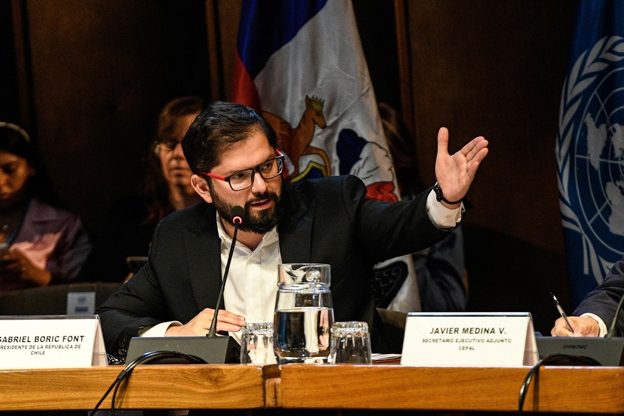 El presidente chileno, Gabriel Boric, pronuncia un discurso durante la inauguración de la tercera reunión de la Conferencia de las Partes del Acuerdo de Escazú, en la sede de la Comisión Económica para América Latina y el Caribe (CEPAL), en Santiago, capital de Chile, el 22 de abril de 2024. (Xinhua/Jorge Villegas)
