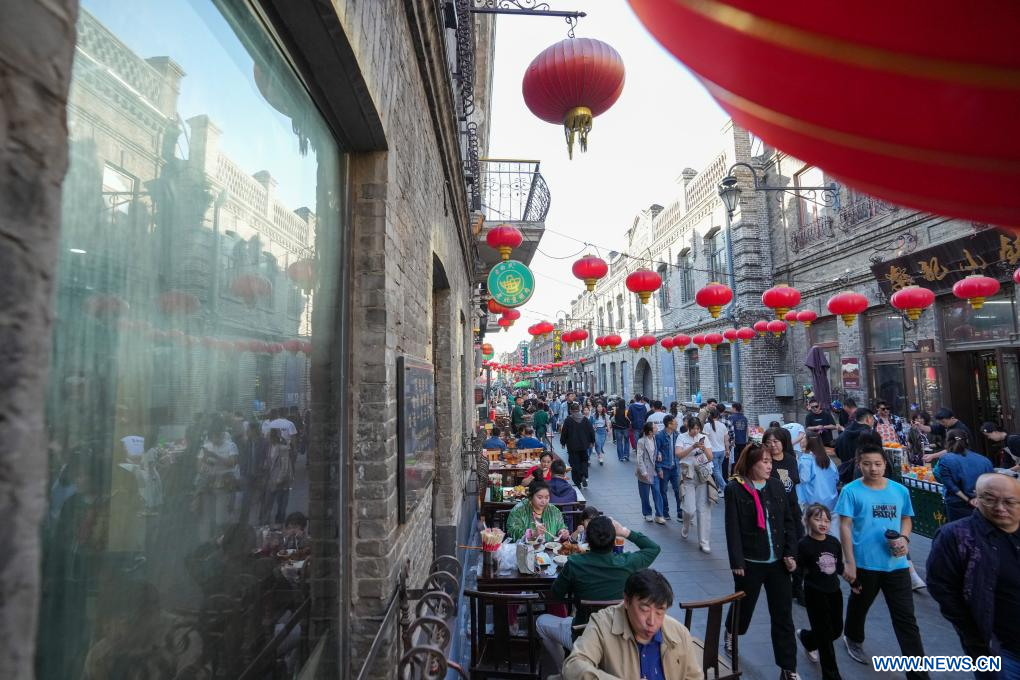 BEIJING, 2 mayo, 2024 (Xinhua) -- Turistas posan para fotografías en la Calle Central, en Harbin, en la provincia de Heilongjiang, en el noreste de China, el 2 de mayo de 2024. (Xinhua/Wang Jianwei)