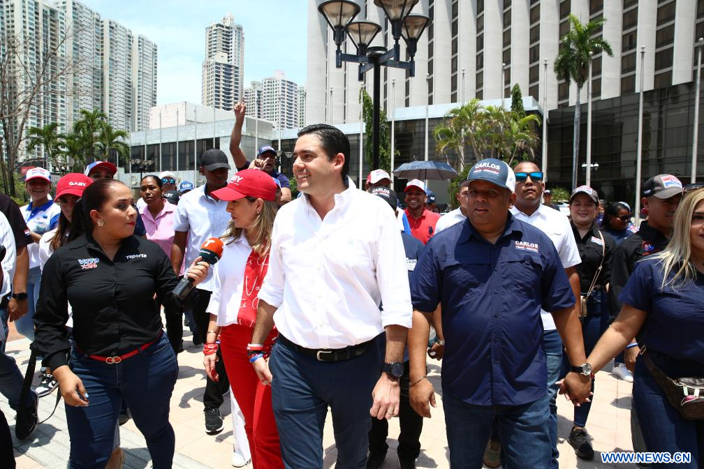 El candidato oficialista a la Presidencia de Panamá, Gabriel Carrizo (c-frente), llega al Centro de Convenciones Atlapa, en la Ciudad de Panamá, capital de Panamá, el 5 de mayo de 2024. Los comicios generales en Panamá comenzaron el domingo a las 07:00 hora local (12:00 GMT) con la apertura de 7.457 mesas de votación en más de 3.000 centros, bajo un ambiente de tranquilidad, en una jornada en la que están habilitados para ejercer su voto más de 3 millones de ciudadanos, según confirmaron las autoridades electorales. (Xinhua/Daniel A. González)