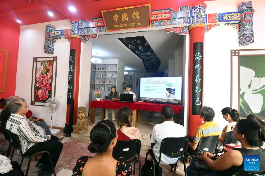 El profesor Ding Ting, director chino del Instituto Confucio de la Universidad de La Habana, diserta sobre "Caracteres y documentos chinos antiguos" ante un grupo de alumnos cubanos del instituto, en La Habana, capital de Cuba, el 8 de mayo de 2024. Estudiantes del Instituto Confucio de la Universidad de La Habana asistieron el miércoles a una documentada conferencia sobre la evolución de los caracteres del idioma chino, actividad que enriqueció el programa docente del centro de estudios. (Xinhua/Joaquín Hernández)