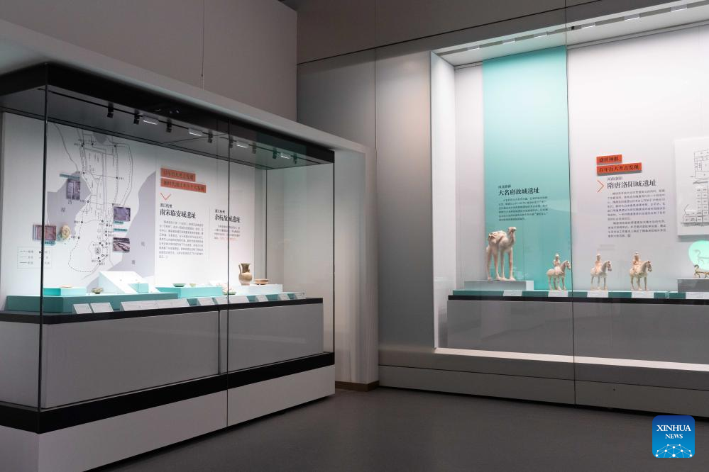Un ladrillo con inscripciones de la dinastía Sui (581-618), una figura de mujer de cerámica vidriada tricolor de la dinastía Tang (618-907) jugando al polo y un cuenco vidriado de color blanco azulado con flores talladas de la dinastía Song (960-1279) son algunos de los objetos expuestos.