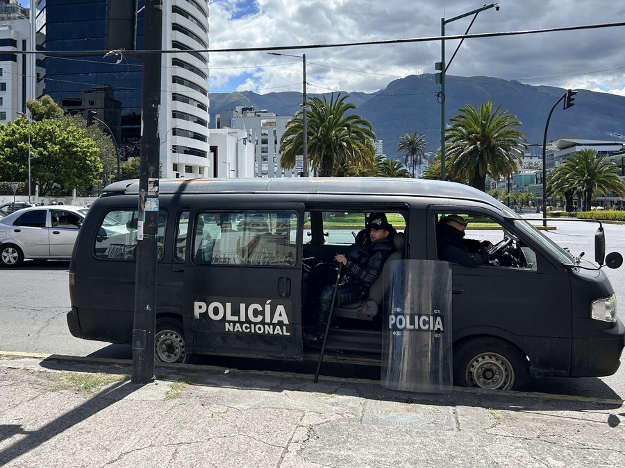 Imagen del 7 de abril de 2024 de policías ecuatorianos montando guardia cerca de la embajada de México en Quito, Ecuador. (Xinhua/Liao Siwei)
