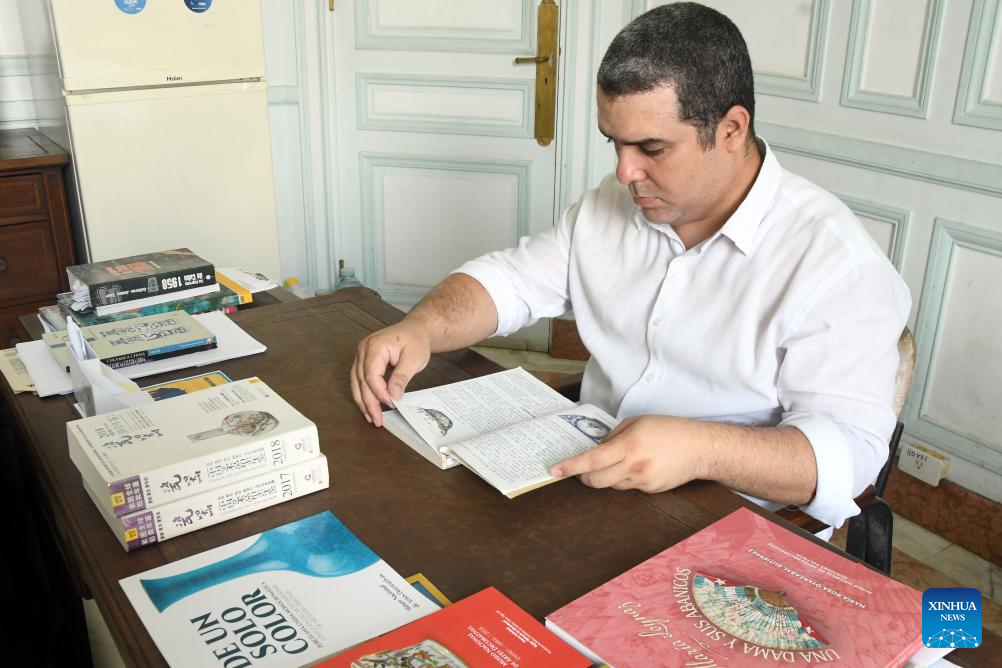 LA HABANA, 30 mayo, 2024 (Xinhua) -- Imagen del 28 de mayo de 2024 del arqueólogo cubano y director del Museo Nacional de Artes Decorativas de La Habana, Yosvanis Fornaris, revisando un libro mientras participa en una entrevista con la Agencia de Noticias Xinhua, en La Habana, capital de Cuba. La presencia y el vínculo de la cultura china está muy arraigada en "este gran mestizaje" que es hoy la figura del cubano, aseguró Fornaris. (Xinhua/Joaquín Hernández)