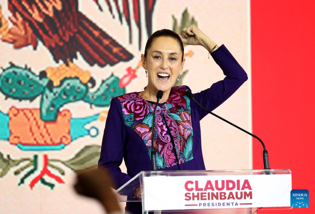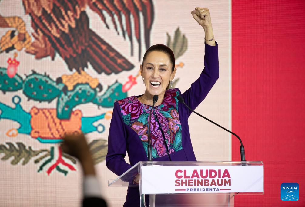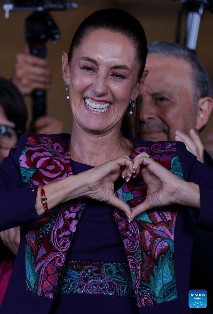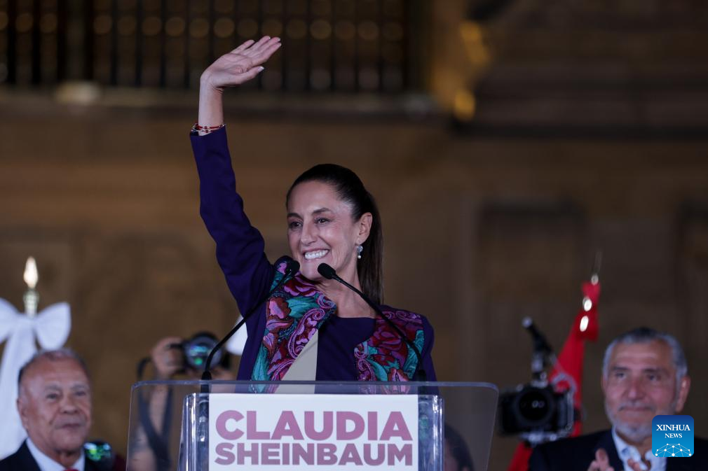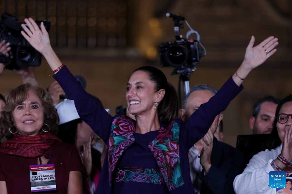 MÉXICO, 3 jun (Xinhua) -- La científica y política mexicana Claudia Sheinbaum, candidata en las elecciones presidenciales de México por la coalición Sigamos Haciendo Historia, celebró la madrugada de este lunes su victoria, después de que el Instituto Nacional Electoral (INE) diera a conocer el resultado del conteo rápido de los votos, en los que aparece a la cabeza con un rango de entre el 58,3 y el 60,7 por ciento.