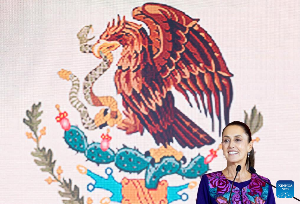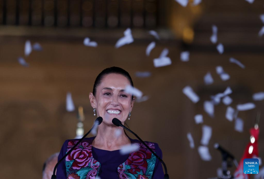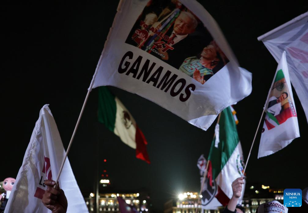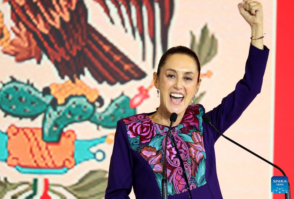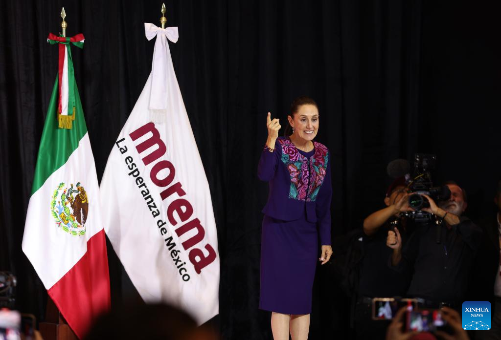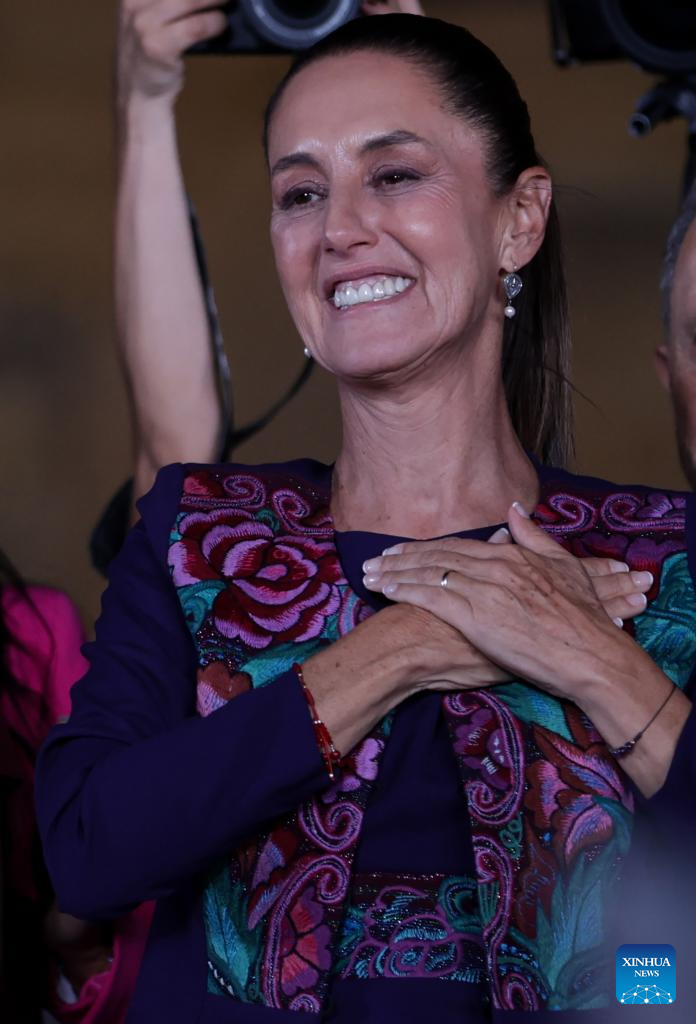 MÉXICO, 3 jun (Xinhua) -- La científica y política mexicana Claudia Sheinbaum, candidata en las elecciones presidenciales de México por la coalición Sigamos Haciendo Historia, celebró la madrugada de este lunes su victoria, después de que el Instituto Nacional Electoral (INE) diera a conocer el resultado del conteo rápido de los votos, en los que aparece a la cabeza con un rango de entre el 58,3 y el 60,7 por ciento.