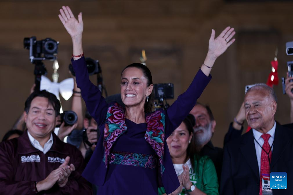 La candidata a la Presidencia de México, Claudia Sheinbaum, saluda a sus simpatizantes en el Zócalo de la Ciudad de México, capital de México, en las primeras horas del 3 de junio de 2024. La científica y política mexicana, Claudia Sheinbaum, candidata en las elecciones presidenciales de México por la coalición Sigamos Haciendo Historia, celebró la madrugada del lunes su victoria, después de que el Instituto Nacional Electoral diera a conocer el resultado del conteo rápido de los votos, en los que aparece a la cabeza con un rango de entre el 58,3 y el 60,7 por ciento. (Xinhua/Francisco Cañedo)