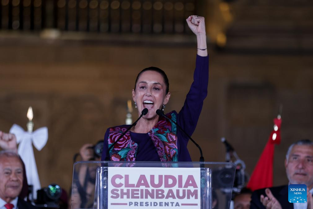 La candidata a la Presidencia de México, Claudia Sheinbaum, habla ante sus simpatizantes en el Zócalo de la Ciudad de México, capital de México, en las primeras horas del 3 de junio de 2024. La científica y política mexicana, Claudia Sheinbaum, candidata en las elecciones presidenciales de México por la coalición Sigamos Haciendo Historia, celebró la madrugada del lunes su victoria, después de que el Instituto Nacional Electoral diera a conocer el resultado del conteo rápido de los votos, en los que aparece a la cabeza con un rango de entre el 58,3 y el 60,7 por ciento. (Xinhua/Francisco Cañedo)
