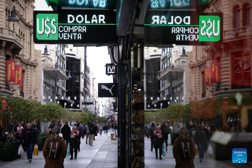 Personas caminan frente a un local de venta de divisas ubicado en el Microcentro, la zona financiera de la ciudad de Buenos Aires, capital de Argentina, el 4 de junio de 2024. (Xinhua/Martín Zabala)
