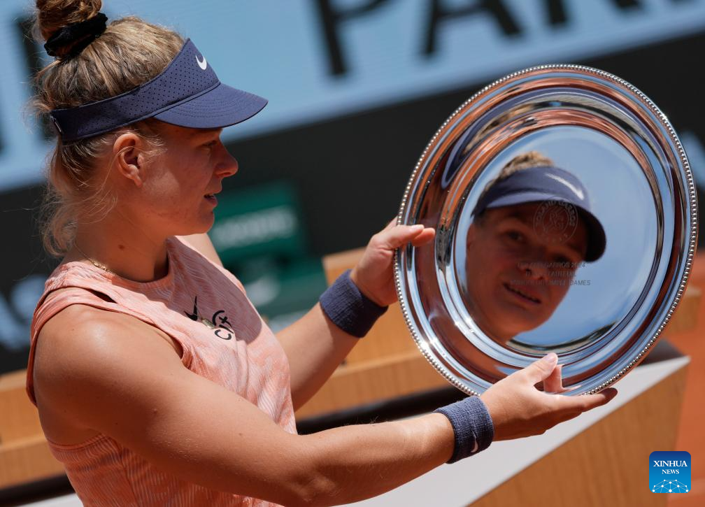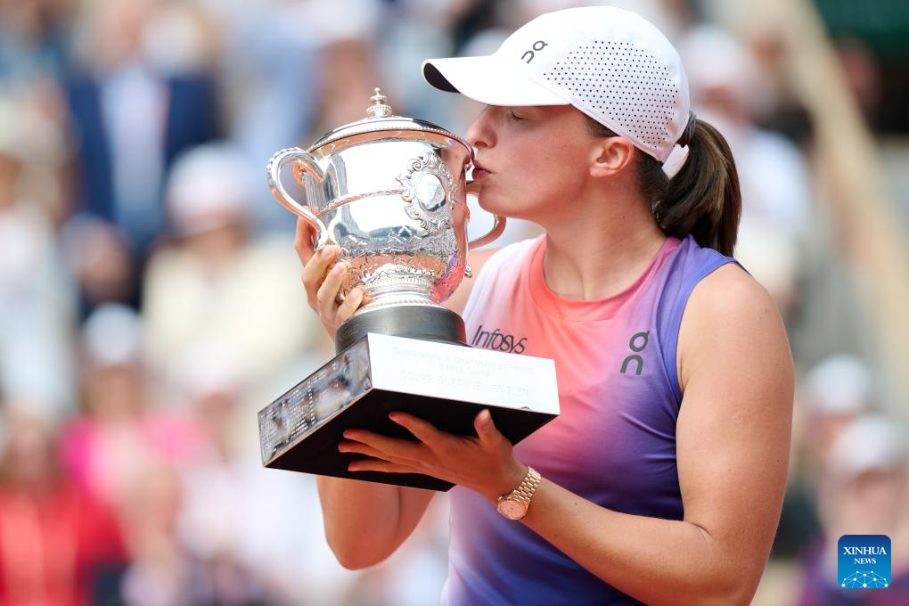 PARÍS, 8 junio, 2024 (Xinhua) -- Iga Swiatek reacciona durante la ceremonia de premiación al término del partido de la final de individuales femeninos entre Iga Swiatek, de Polonia, y Jasmine Paolini, de Italia, en el torneo de tenis Abierto de Francia en Roland Garros, en París, Francia, el 8 de junio de 2024. (Xinhua/Meng Dingbo)