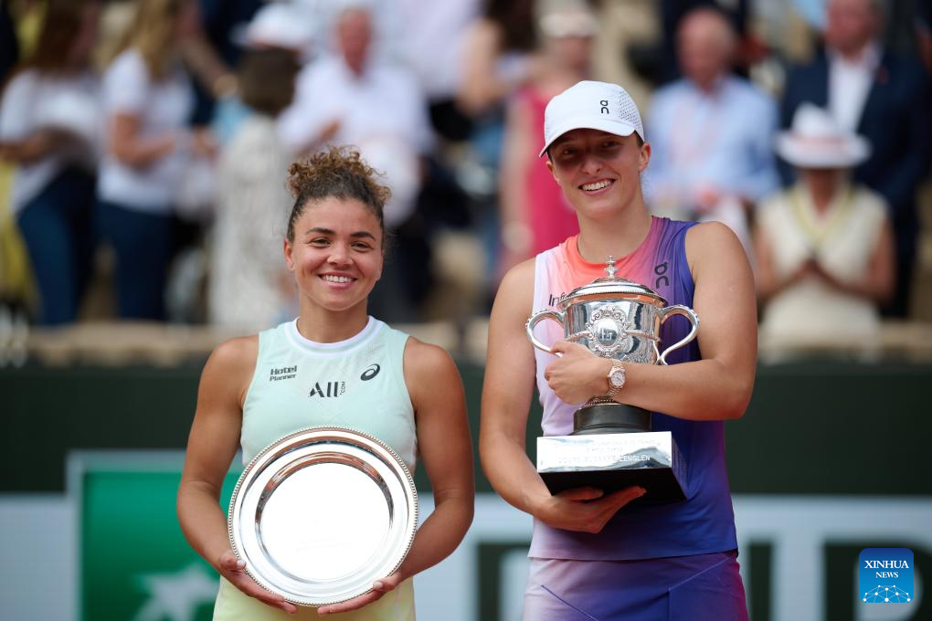 PARÍS, 8 junio, 2024 (Xinhua) -- Iga Swiatek (d) y Jasmine Paolini (i) reaccionan durante la ceremonia de premiación al término del partido de la final de individuales femeninos entre Iga Swiatek, de Polonia, y Jasmine Paolini, de Italia, en el torneo de tenis Abierto de Francia en Roland Garros, en París, Francia, el 8 de junio de 2024. (Xinhua/Meng Dingbo)
