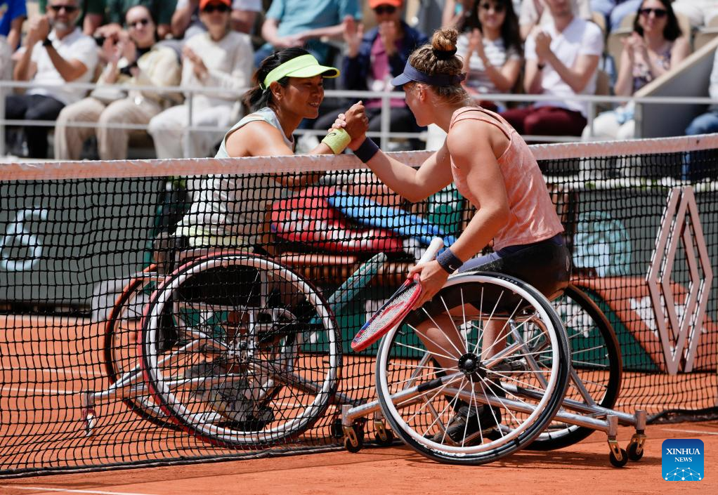 PARÍS, 8 junio, 2024 (Xinhua) -- Zhu Zhenzhen (i) saluda a Diede De Groot al término de la final de individuales femeninos en silla de ruedas entre Zhu Zhenzhen, de China, y Diede De Groot, de Países Bajos, en el torneo de tenis Abierto de Francia en Roland Garros, en París, Francia, el 8 de junio de 2024. (Xinhua/Gao Jing)