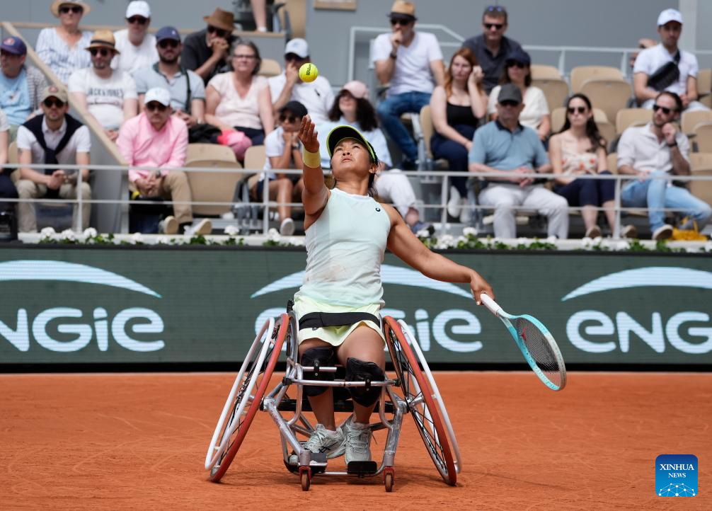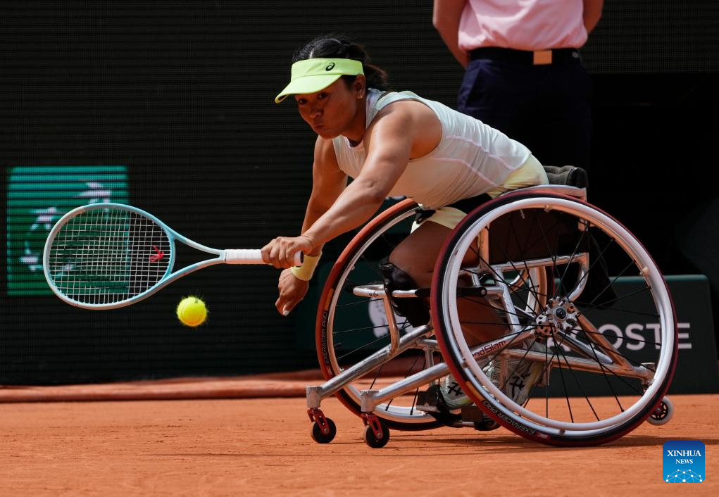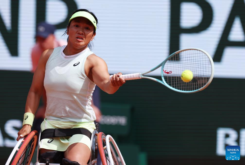PARÍS, 8 junio, 2024 (Xinhua) -- Zhu Zhenzhen compite durante la final de individuales femeninos en silla de ruedas entre Zhu Zhenzhen, de China, y Diede De Groot, de Países Bajos, en el torneo de tenis Abierto de Francia en Roland Garros, en París, Francia, el 8 de junio de 2024. (Xinhua/Gao Jing)