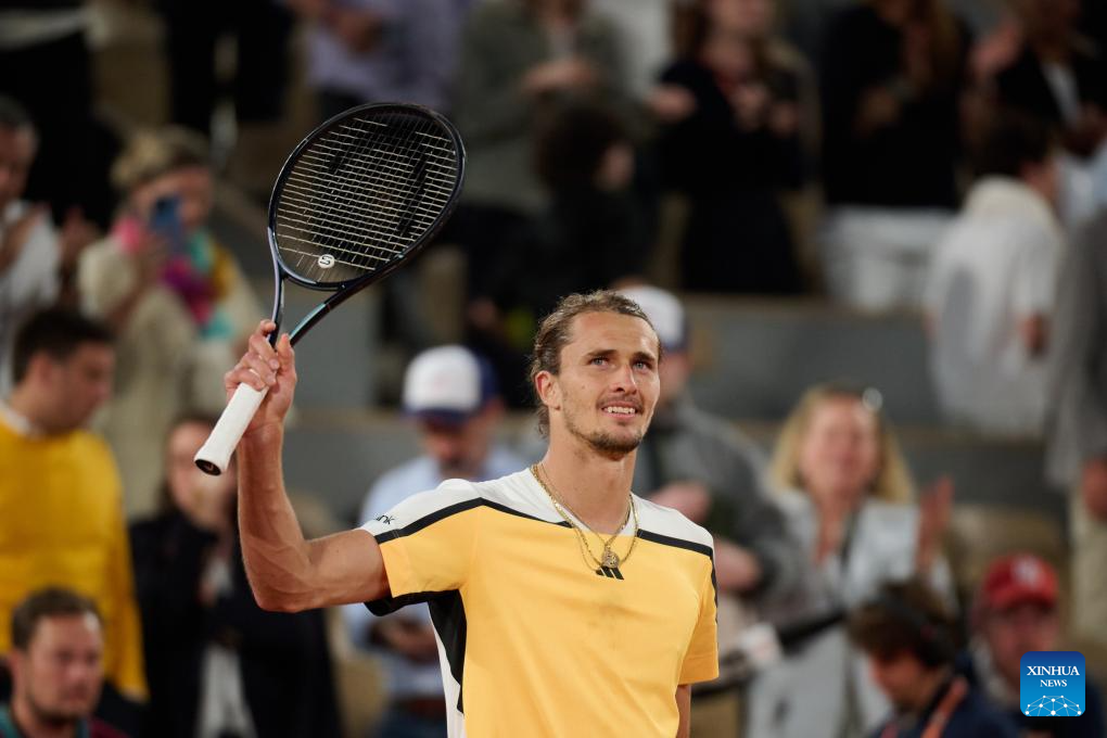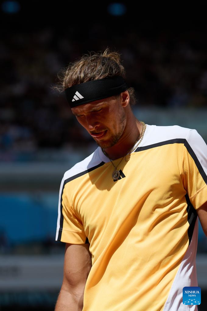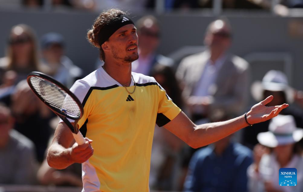 PARIS, 9 junio, 2024 (Xinhua) -- Alexander Zverev reacciona durante el partido de la final de individuales masculinos entre Carlos Alcaraz, de España, y Alexander Zverev, de Alemania, en el torneo de tenis Abierto de Francia en Roland Garros, en París, Francia, el 9 de junio de 2024. (Xinhua/Meng Dingbo)