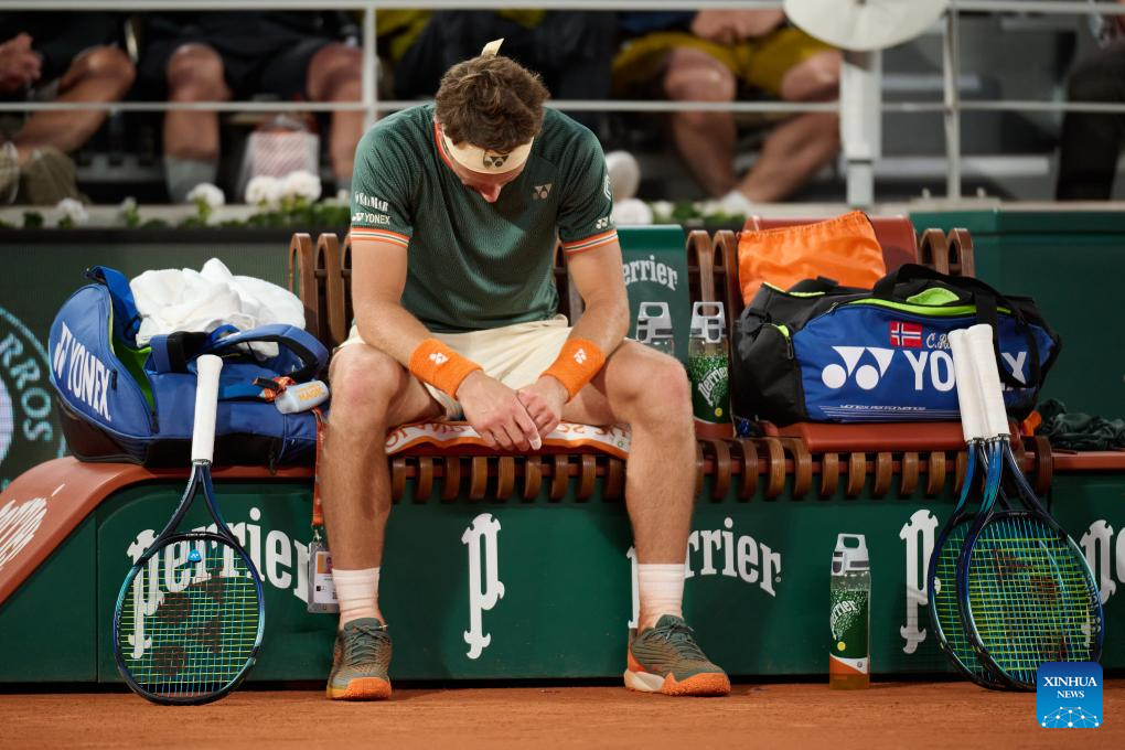 PARÍS, 8 junio, 2024 (Xinhua) -- Imagen del 7 de junio de 2024 de Casper Ruud reaccionando durante el partido de semifinal de individuales masculinos entre Alexander Zverev, de Alemania, y Casper Ruud, de Noruega, en el torneo de tenis Abierto de Francia en Roland Garros, en París, Francia. (Xinhua/Meng Dingbo)