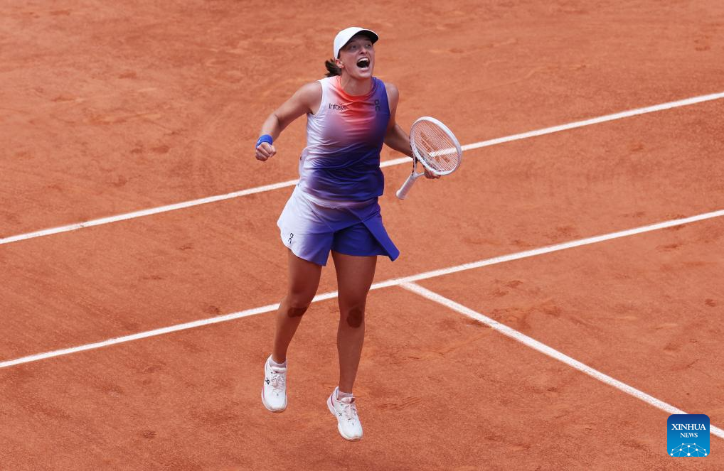 PARÍS, 8 junio, 2024 (Xinhua) -- Iga Swiatek festeja después de ganar el partido final de individuales femeninos entre Iga Swiatek, de Polonia, y Jasmine Paolini, de Italia, en el torneo de tenis Abierto de Francia en Roland Garros, en París, Francia, el 8 de junio de 2024. (Xinhua/Gao Jing)