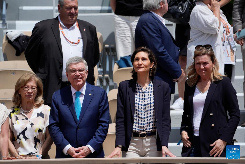 PARÍS, 8 junio, 2024 (Xinhua) -- El presidente del COI, Thomas Bach (2-i), y la ministra francesa de Deportes, Amelie Oudea-Castera (2-d), son vistos durante la final de individuales femeninos en silla de ruedas entre Zhu Zhenzhen, de China, y Diede De Groot, de Países Bajos, en el torneo de tenis Abierto de Francia en Roland Garros, en París, Francia, el 8 de junio de 2024. (Xinhua/Gao Jing)