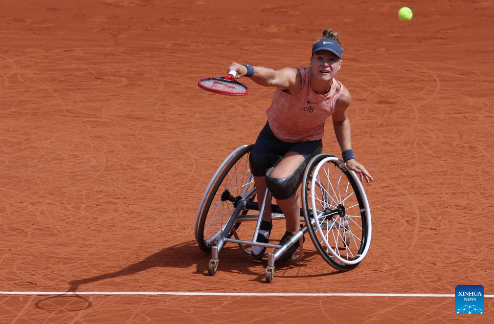 PARÍS, 8 junio, 2024 (Xinhua) -- Diede De Groot compite durante la final de individuales femeninos en silla de ruedas entre Zhu Zhenzhen, de China, y Diede De Groot, de Países Bajos, en el torneo de tenis Abierto de Francia en Roland Garros, en París, Francia, el 8 de junio de 2024. (Xinhua/Gao Jing)