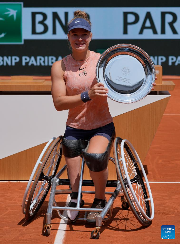 PARIS, 8 junio, 2024 (Xinhua) -- Diede De Groot posa con su placa durante la ceremonia de premiación al término de la final de individuales femeninos en silla de ruedas entre Zhu Zhenzhen, de China, y Diede De Groot, de Países Bajos, en el torneo de tenis Abierto de Francia en Roland Garros, en París, Francia, el 8 de junio de 2024. (Xinhua/Gao Jing)