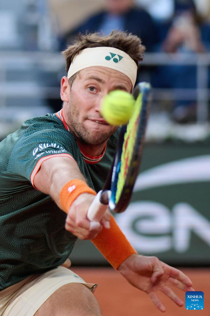PARÍS, 8 junio, 2024 (Xinhua) -- Imagen del 7 de junio de 2024 de Casper Ruud devolviendo la pelota durante el partido de semifinal de individuales masculinos entre Alexander Zverev, de Alemania, y Casper Ruud, de Noruega, en el torneo de tenis Abierto de Francia en Roland Garros, en París, Francia. (Xinhua/Meng Dingbo)