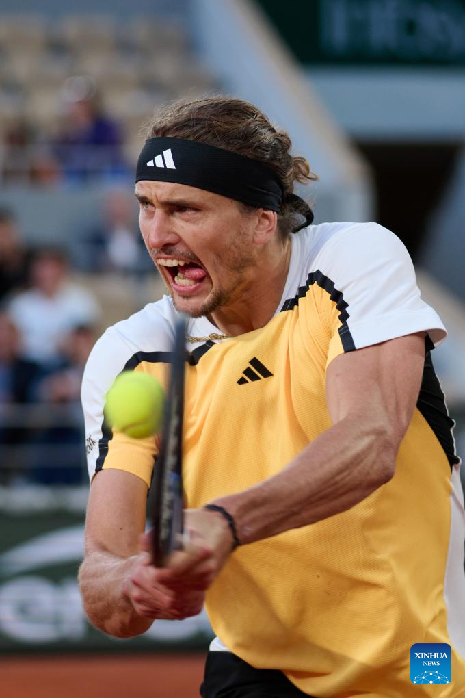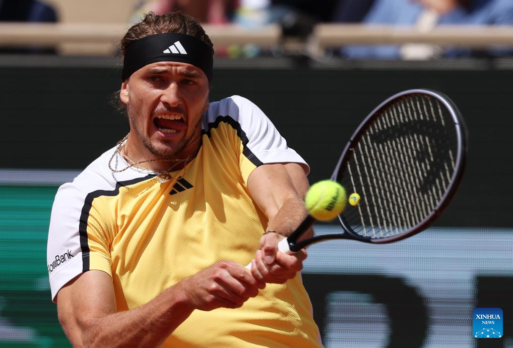 PARIS, 9 junio, 2024 (Xinhua) -- Alexander Zverev devuelve la pelota durante el partido de la final de individuales masculinos entre Carlos Alcaraz, de España, y Alexander Zverev, de Alemania, en el torneo de tenis Abierto de Francia en Roland Garros, en París, Francia, el 9 de junio de 2024. (Xinhua/Gao Jing)