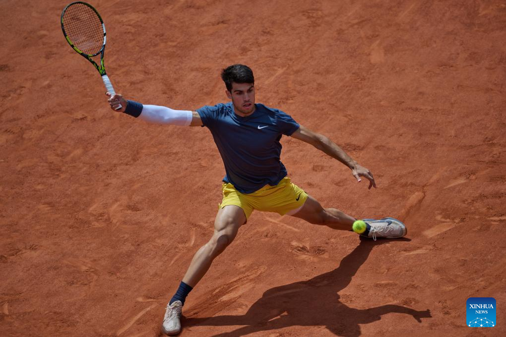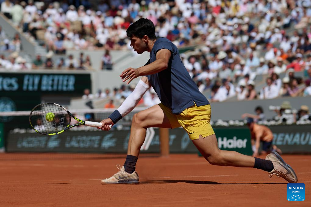 PARIS, 9 junio, 2024 (Xinhua) -- Carlos Alcaraz devuelve la pelota durante el partido de la final de individuales masculinos entre Carlos Alcaraz, de España, y Alexander Zverev, de Alemania, en el torneo de tenis Abierto de Francia en Roland Garros, en París, Francia, el 9 de junio de 2024. (Xinhua/Gao Jing)