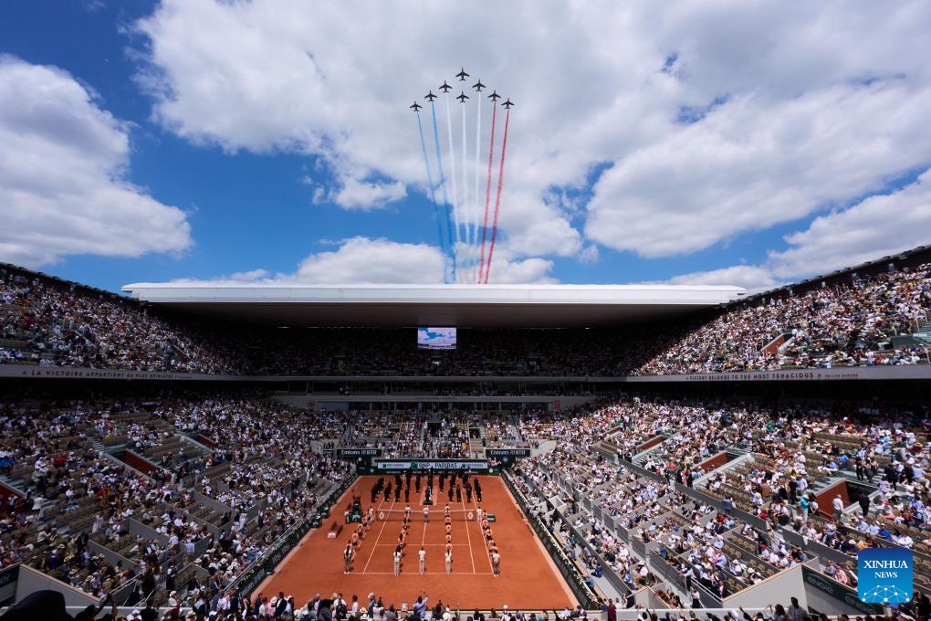 PARIS, 9 junio, 2024 (Xinhua) -- El equipo de acrobacias aéreas de élite de la Fuerza Aérea francesa "Patrouille de France" (PAF), vuela sobre la cancha Philippe-Chatrier previo al partido de la final de individuales masculinos entre Carlos Alcaraz, de España, y Alexander Zverev, de Alemania, en el torneo de tenis Abierto de Francia en Roland Garros, en París, Francia, el 9 de junio de 2024. (Xinhua/Meng Dingbo)