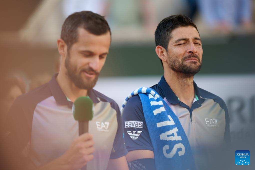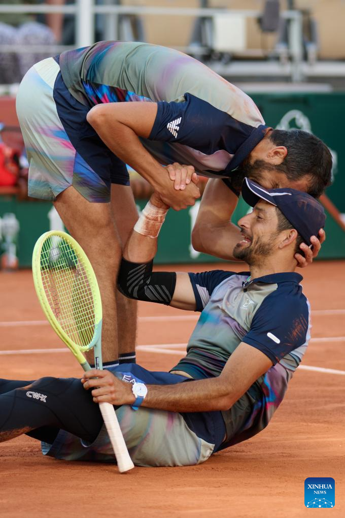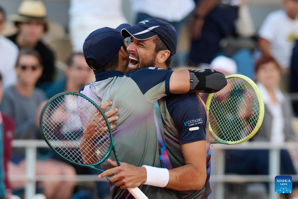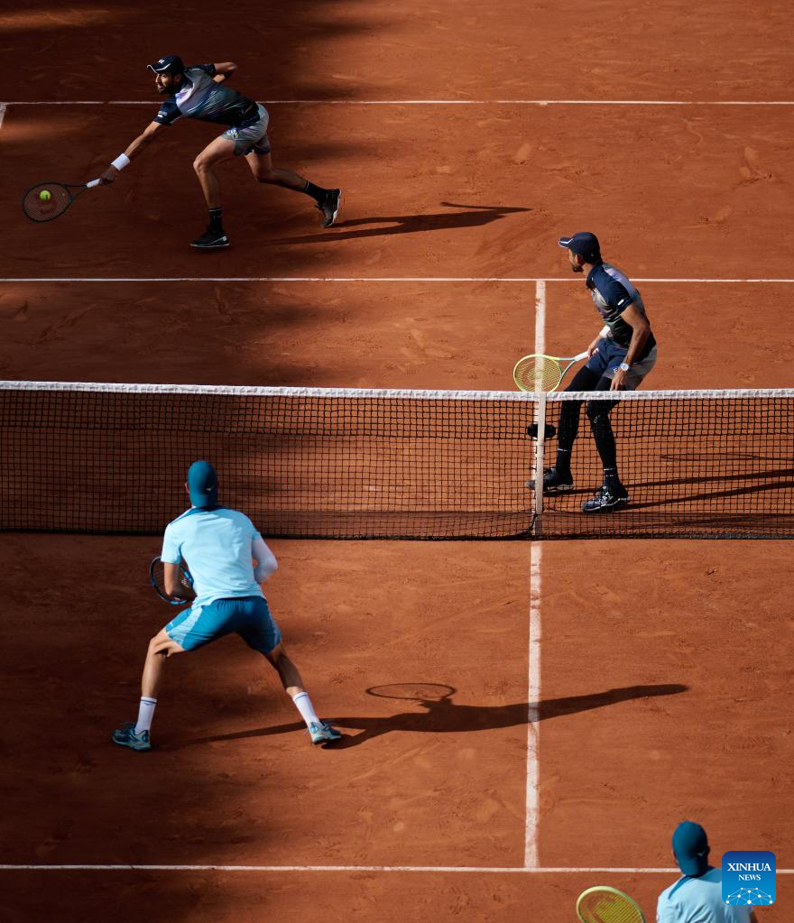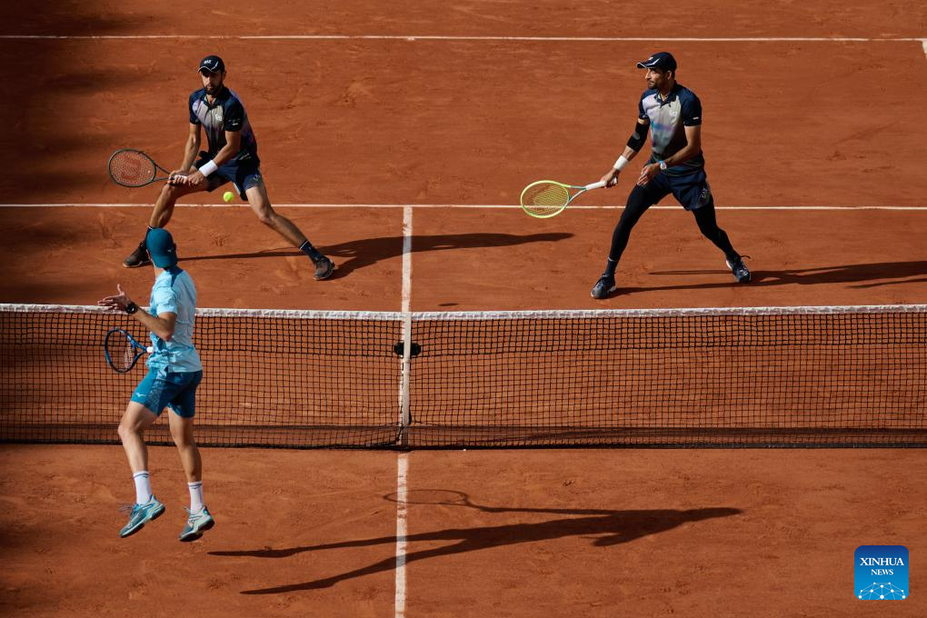 PARIS, 9 junio, 2024 (Xinhua) -- Imagen del 8 de junio de 2024 de Marcelo Arévalo (d-arriba)/Mate Pavic (i-arriba) compitiendo durante el partido de la final de dobles masculinos entre Marcelo Arévalo (El Salvador)/Mate Pavic (Croacia), y Simone Bolelli/Andrea Vavassori, de Italia, en el torneo de tenis Abierto de Francia en Roland Garros, en París, Francia. (Xinhua/Meng Dingbo)