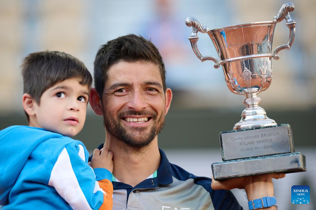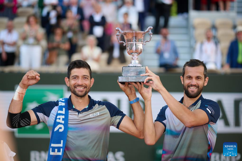 PARIS, 9 junio, 2024 (Xinhua) -- Imagen del 8 de junio de 2024 de los ganadores Marcelo Arévalo/Mate Pavic (d) posando con su trofeo durante la ceremonia de premiación después del partido de la final de dobles masculinos entre Marcelo Arévalo (El Salvador)/Mate Pavic (Croacia), y Simone Bolelli/Andrea Vavassori, de Italia, en el torneo de tenis Abierto de Francia en Roland Garros, en París, Francia. (Xinhua/Meng Dingbo)