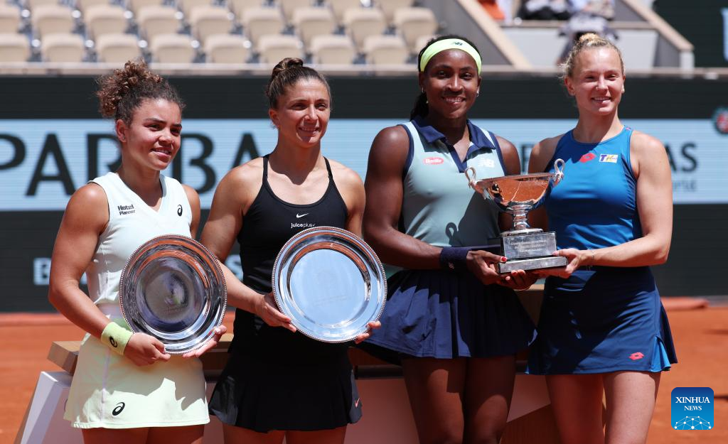 PARIS, 9 junio, 2024 (Xinhua) -- Jasmine Paolini (i)/Sara Errani (2-i), y Coco Gauff (2-d)/Katerina Siniakova posan durante la ceremonia de premiación de la final de dobles femeninos entre Jasmine Paolini/Sara Errani, de Italia, y Coco Gauff (Estados Unidos)/Katerina Siniakova (República Checa), en el torneo de tenis Abierto de Francia en Roland Garros, en París, Francia, el 9 de junio de 2024. (Xinhua/Gao Jing)