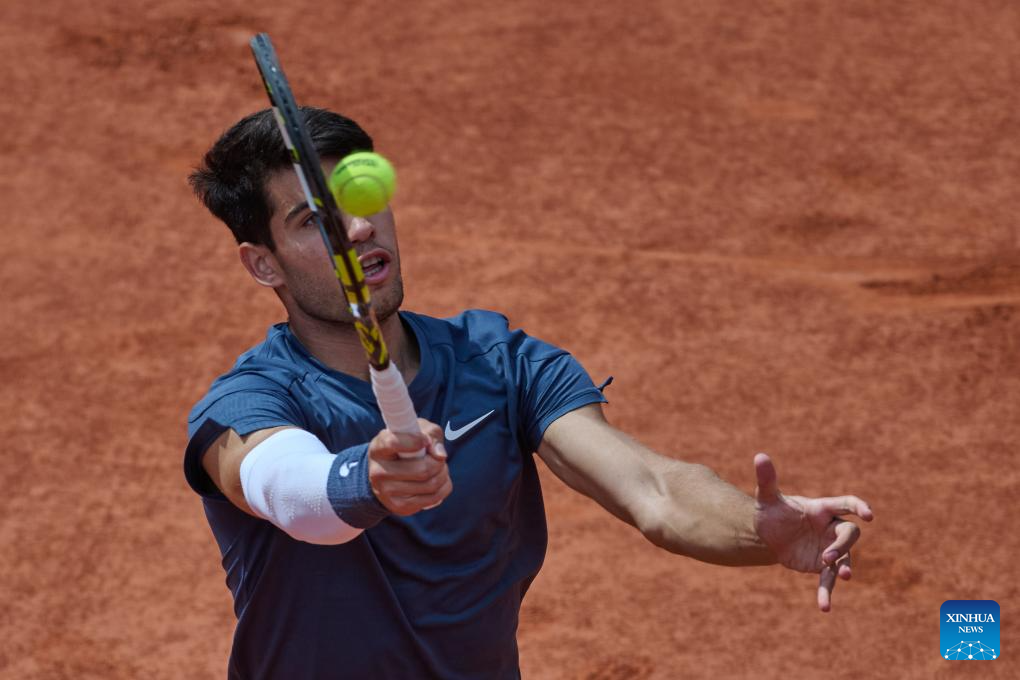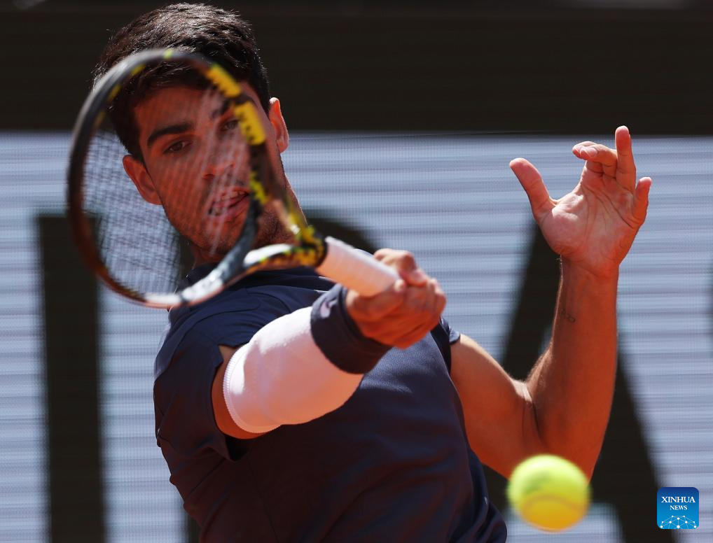 PARIS, 9 junio, 2024 (Xinhua) -- Carlos Alcaraz devuelve la pelota durante el partido de la final de individuales masculinos entre Carlos Alcaraz, de España, y Alexander Zverev, de Alemania, en el torneo de tenis Abierto de Francia en Roland Garros, en París, Francia, el 9 de junio de 2024. (Xinhua/Meng Dingbo)