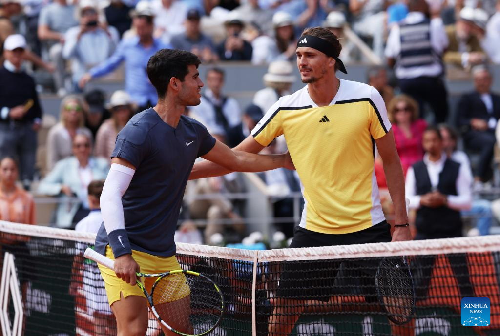 PARIS, 9 junio, 2024 (Xinhua) -- Carlos Alcaraz (i) saluda a Alexander Zverev previo al partido de la final de individuales masculinos entre Carlos Alcaraz, de España, y Alexander Zverev, de Alemania, en el torneo de tenis Abierto de Francia en Roland Garros, en París, Francia, el 9 de junio de 2024. (Xinhua/Gao Jing)