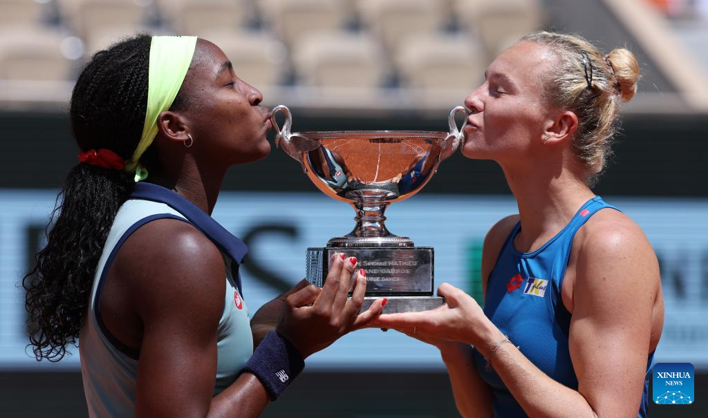 PARIS, 9 junio, 2024 (Xinhua) -- Coco Gauff (i)/Katerina Siniakova besan el trofeo durante la ceremonia de premiación de la final de dobles femeninos entre Jasmine Paolini/Sara Errani, de Italia, y Coco Gauff (Estados Unidos)/Katerina Siniakova (República Checa), en el torneo de tenis Abierto de Francia en Roland Garros, en París, Francia, el 9 de junio de 2024. (Xinhua/Gao Jing)