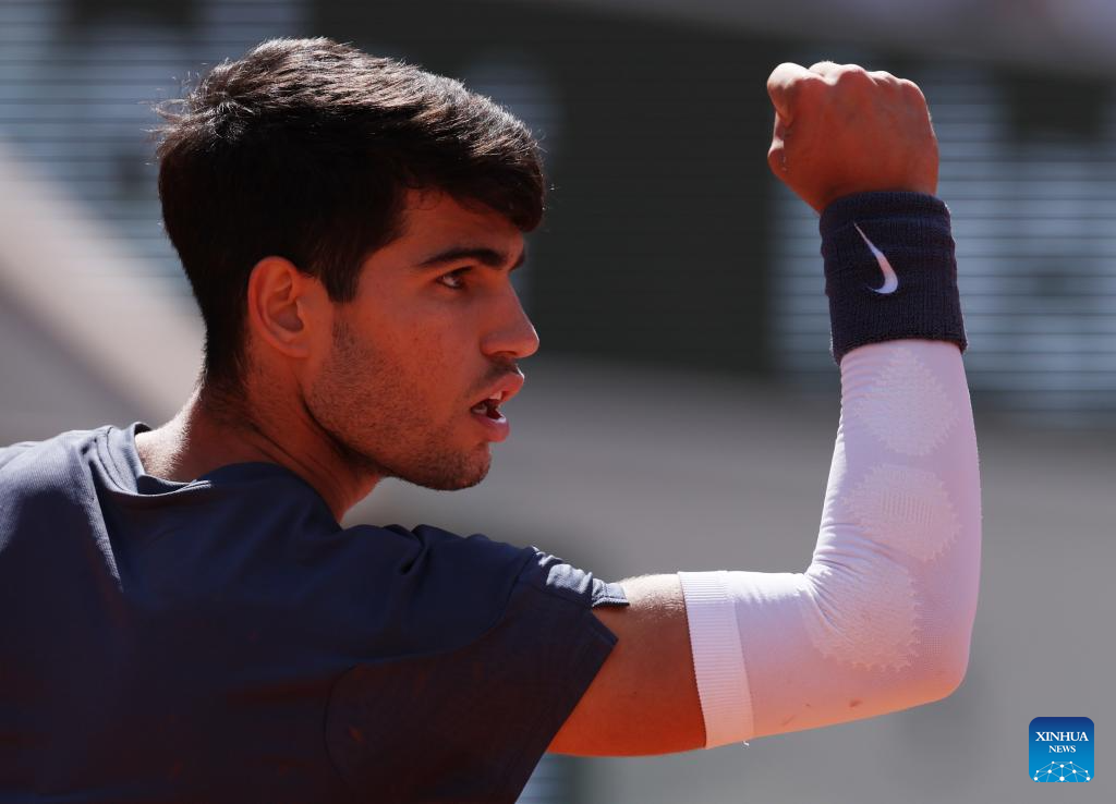 PARIS, 9 junio, 2024 (Xinhua) -- Carlos Alcaraz gesticula durante el partido de la final de individuales masculinos entre Carlos Alcaraz, de España, y Alexander Zverev, de Alemania, en el torneo de tenis Abierto de Francia en Roland Garros, en París, Francia, el 9 de junio de 2024. (Xinhua/Gao Jing)