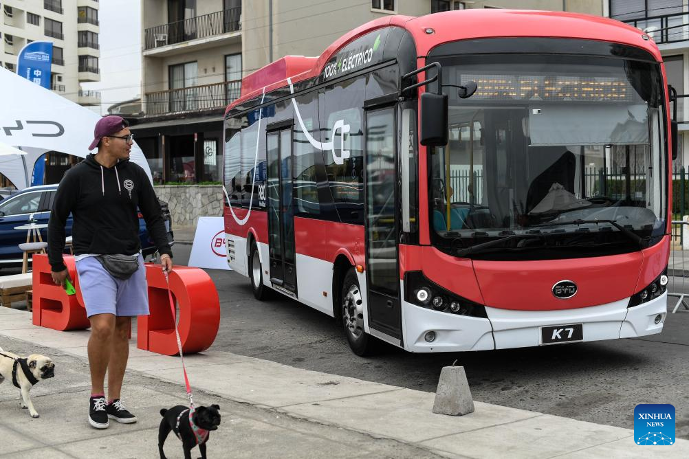 Imagen del 5 marzo de 2024 de una persona caminando frente a un autobús exhibido durante la primera Exposición Itinerante Internacional de Automóviles Chinos en Chile, organizada por el Consejo Chino para el Fomento del Comercio Internacional, en Viña del Mar, Chile. Medidas proteccionistas como la imposición de aranceles adicionales a los vehículos eléctricos chinos, anunciadas recientemente por la Comisión Europea y Estados Unidos, perjudican la transición hacia la electromovilidad y su desarrollo a bajo costo, dijo el académico chileno Cristian García. (Xinhua/Jorge Villegas)
