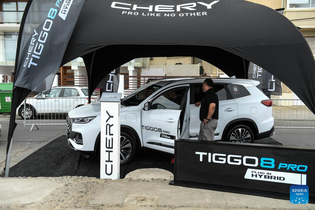 Imagen del 5 marzo de 2024 de una persona observando un automóvil durante la primera Exposición Itinerante Internacional de Automóviles Chinos en Chile, organizada por el Consejo Chino para el Fomento del Comercio Internacional, en Viña del Mar, Chile. Medidas proteccionistas como la imposición de aranceles adicionales a los vehículos eléctricos chinos, anunciadas recientemente por la Comisión Europea y Estados Unidos, perjudican la transición hacia la electromovilidad y su desarrollo a bajo costo, dijo el académico chileno Cristian García. (Xinhua/Jorge Villegas)