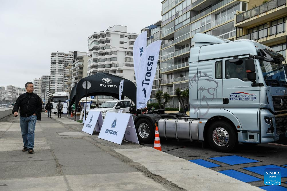 Imagen del 5 marzo de 2024 de una persona caminando frente a un tráiler exhibido durante la primera Exposición Itinerante Internacional de Automóviles Chinos en Chile, organizada por el Consejo Chino para el Fomento del Comercio Internacional, en Viña del Mar, Chile. Medidas proteccionistas como la imposición de aranceles adicionales a los vehículos eléctricos chinos, anunciadas recientemente por la Comisión Europea y Estados Unidos, perjudican la transición hacia la electromovilidad y su desarrollo a bajo costo, dijo el académico chileno Cristian García. (Xinhua/Jorge Villegas)