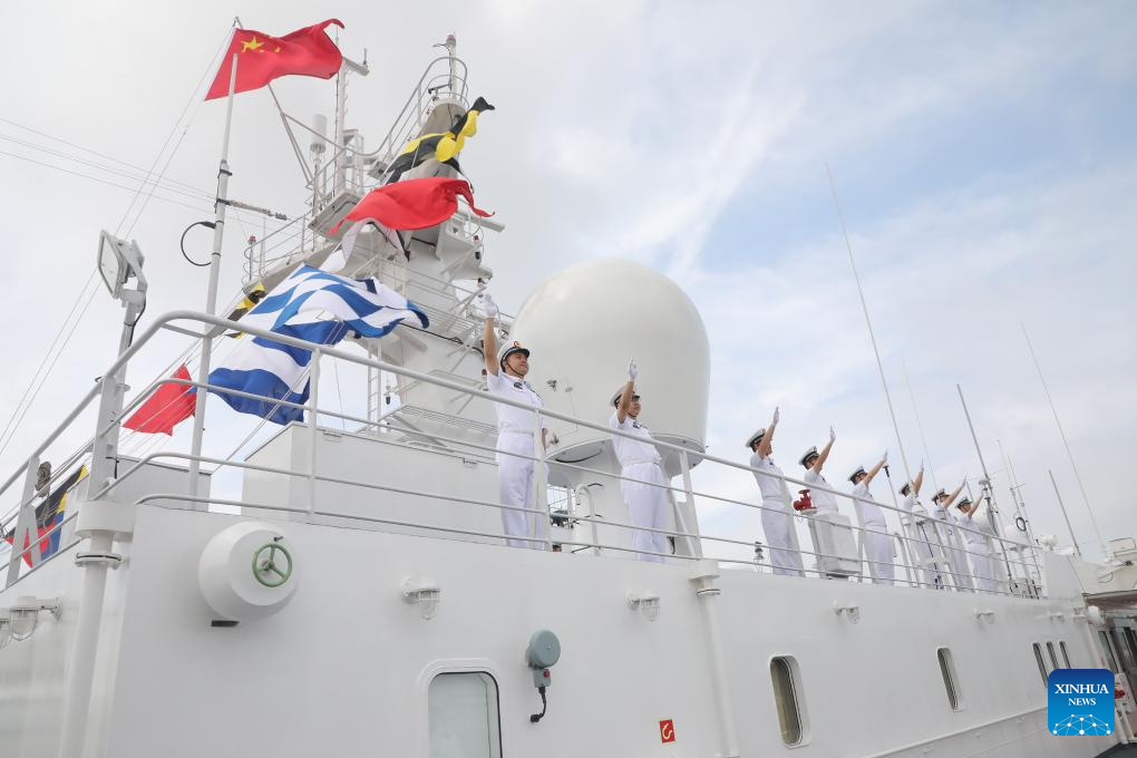 Miembros de la tripulación del buque hospital "Arca de la Paz" de la Armada del Ejército Popular de Liberación (EPL) de China se despiden en un puerto, en Zhoushan, en la provincia de Zhejiang, en el este de China, el 16 de junio de 2024. El buque hospital "Arca de la Paz" de la Armada del Ejército Popular de Liberación (EPL) de China zarpó el domingo por la mañana de un puerto militar en Zhoushan, provincia de Zhejiang, en el este de China, para llevar a cabo la "Misión Armonía-2024". Durante la misión, la embarcación visitará 13 países, a saber, Seychelles, Tanzania, Madagascar, Mozambique, Sudáfrica, Angola, República del Congo, Gabón, Camerún, Benín, Mauritania, Yibuti y Sri Lanka, y prestará servicios médicos a la población local. También hará escalas en puertos de Francia y Grecia. (Xinhua/Liu Zhilei)