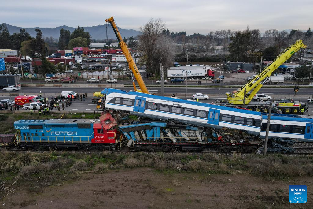 Personas trabajan en el sitio de un accidente de tren, en la comuna de San Bernardo, en Santiago, capital de Chile, el 20 de junio de 2024. Al menos dos muertos y nueve heridos dejó un choque frontal de dos trenes registrado en la madrugada en la comuna de San Bernardo, al sur de la región Metropolitana de Santiago, en la zona centro de Chile, informó el jueves la Empresa de los Ferrocarriles del Estado. (Xinhua/Str)