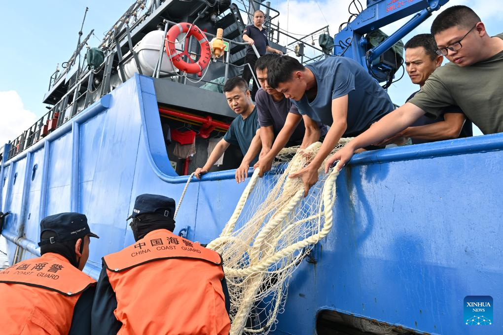 SANSHA, 21 junio, 2024 (Xinhua) -- Imagen del 11 de junio de 2024 de agentes de la ley de la Guardia Costera de China retirando las redes de pesca desplegadas por personal filipino cerca del buque de transporte de la marina filipina varado ilegalmente, en Ren'ai Jiao de China y el mar territorial circundante. Recientemente, en Ren'ai Jiao de China y el mar territorial circundante, el personal del buque de transporte de la armada filipina varado ilegalmente dañó repetidamente las redes de los pescadores chinos y desplegó las redes de pesca obtenidas ilegalmente en las aguas cercanas de su barco para obstruir la aplicación de la ley de la Guardia Costera de China (CCG, por sus siglas en inglés). Los agentes de la ley de la CCG han recuperado estas redes de pesca obtenidas ilegalmente y las han devuelto a los pescadores chinos para recuperar sus pérdidas económicas. (Xinhua/Guardia Costera de China)