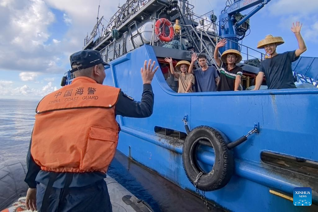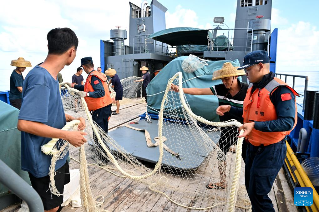 SANSHA, 21 junio, 2024 (Xinhua) -- Imagen del 11 de junio de 2024 de un agente de la ley de la Guardia Costera de China despidiéndose de pescadores chinos después de devolverles las redes de pesca recuperadas, en Ren'ai Jiao de China y el mar territorial circundante. Recientemente, en Ren'ai Jiao de China y el mar territorial circundante, el personal del buque de transporte de la armada filipina varado ilegalmente dañó repetidamente las redes de los pescadores chinos y desplegó las redes de pesca obtenidas ilegalmente en las aguas cercanas de su barco para obstruir la aplicación de la ley de la Guardia Costera de China (CCG, por sus siglas en inglés). Los agentes de la ley de la CCG han recuperado estas redes de pesca obtenidas ilegalmente y las han devuelto a los pescadores chinos para recuperar sus pérdidas económicas. (Xinhua/Guardia Costera de China)