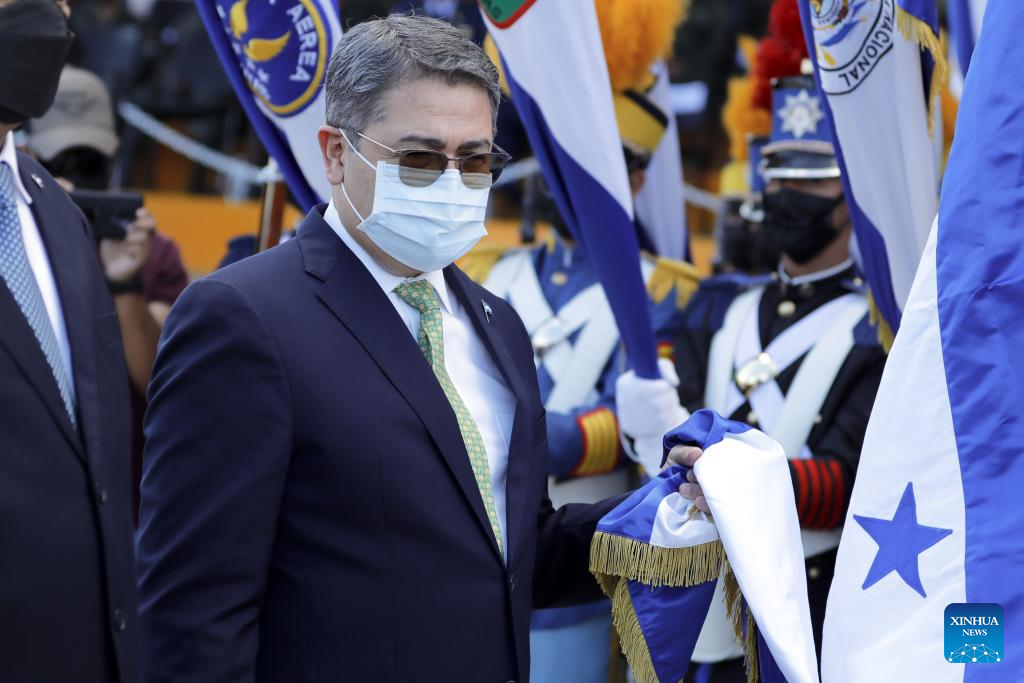 Imagen del 21 de diciembre de 2021 del entonces presidente hondureño, Juan Orlando Hernández, asistiendo a la ceremonia del traspaso de mando de la jefatura del Estado Mayor Conjunto de las Fuerzas Armadas de Honduras en las instalaciones de Campo de Parada Marte, en Tegucigalpa, Honduras. Hernández fue sentenciado el miércoles a 45 años de cárcel por una corte de Nueva York, Estados Unidos, por delitos relacionados con el narcotráfico y uso de armas. (Xinhua/Rafael Ochoa)