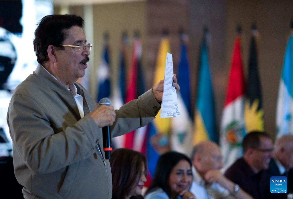 TEGUCIGALPA, 27 junio, 2024 (Xinhua) -- El expresidente hondureño, Manuel Zelaya, habla durante la segunda edición de la CELAC Social, en Tegucigalpa, Honduras, el 27 de junio de 2024. La segunda edición de la CELAC Social, un espacio de análisis e intercambio autoconvocado desde las organizaciones sociales, sindicales y populares de la región latinoamericana y caribeña, inició el jueves en la capital de Honduras, en el marco del 15º aniversario del golpe de Estado contra el entonces presidente hondureño Manuel Zelaya. (Xinhua/David de la Paz)