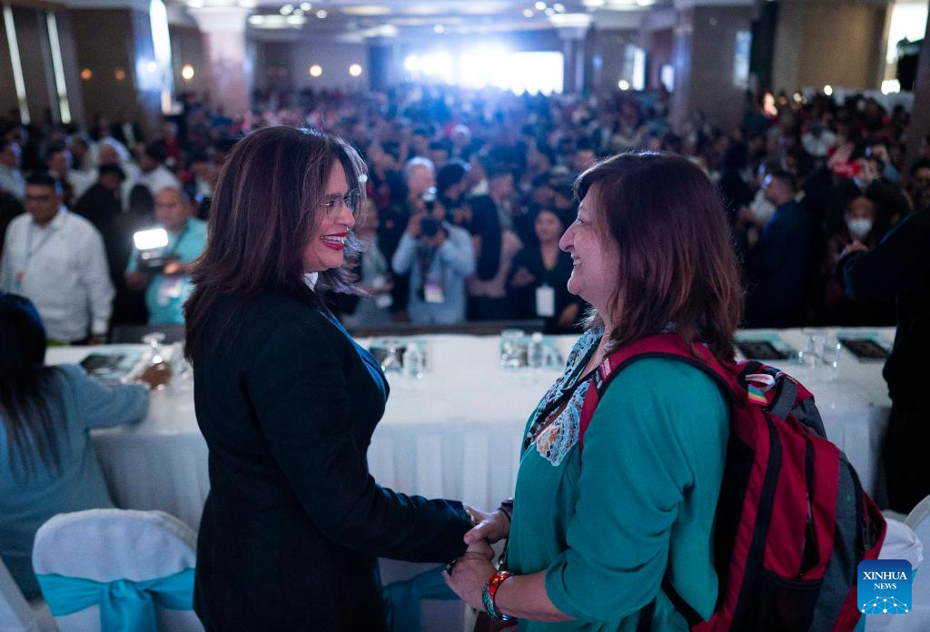 TEGUCIGALPA, 27 junio, 2024 (Xinhua) -- La precandidata a la Presidencia de Honduras, Rixi Moncada (i), conversa con la secretaria ejecutiva del Foro de Sao Paulo, Mónica Valente (d), durante la segunda edición de la CELAC Social, en Tegucigalpa, Honduras, el 27 de junio de 2024. La segunda edición de la CELAC Social, un espacio de análisis e intercambio autoconvocado desde las organizaciones sociales, sindicales y populares de la región latinoamericana y caribeña, inició el jueves en la capital de Honduras, en el marco del 15º aniversario del golpe de Estado contra el entonces presidente hondureño Manuel Zelaya. (Xinhua/David de la Paz)