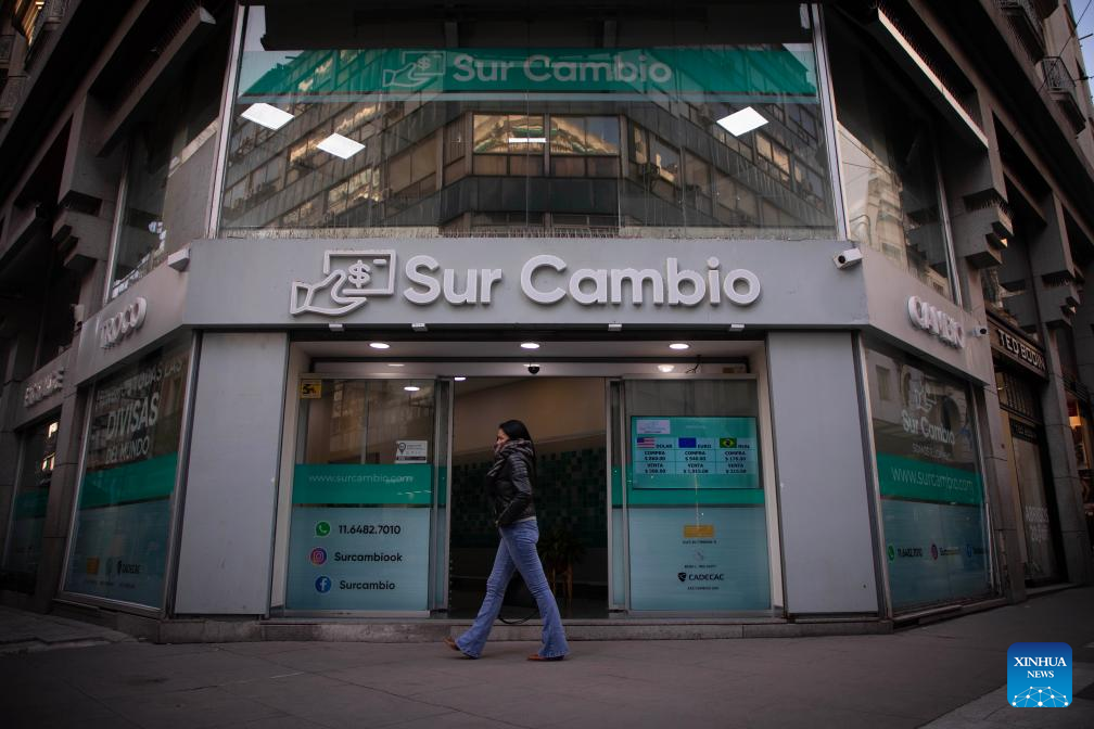 Una mujer camina frente a un local de venta de divisas, en la ciudad de Buenos Aires, capital de Argentina, el 1 de julio de 2024. (Xinhua/Martín Zabala)